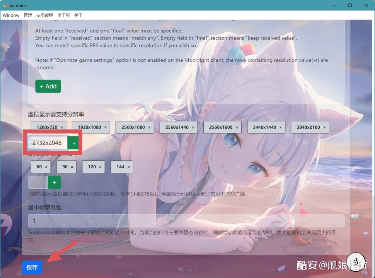 在虚拟显示器支持分辨率中添加平板或手机的分辨率,分辨率如何获取将在下文中介绍,请注意如图所示的2732x2048中的x不是乘号而是字母,添加好后点击保存应用。