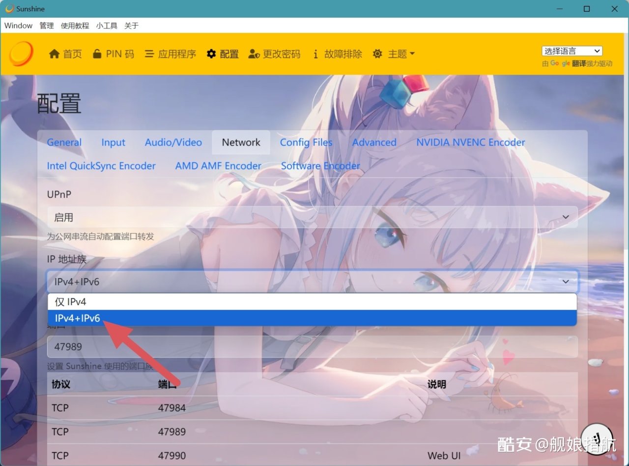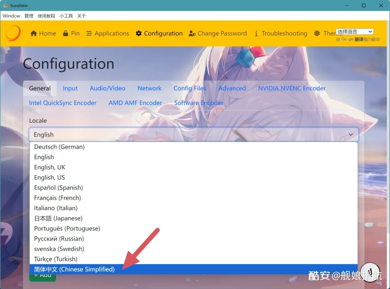 Configuration——General——Locale——简体中文——保存应用,关闭Sunshine再重新打开即可切换至中文。