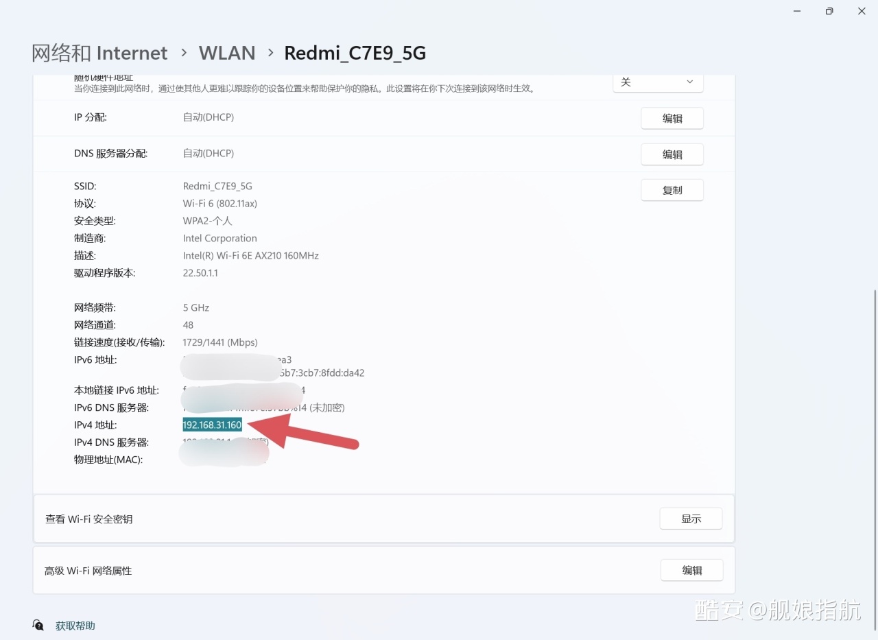 将你的安卓设备与电脑连在同一局域网中,然后在Windows设置中获取电脑局域网地址,下图中楼主电脑的局域网地址为192.168.31.160。