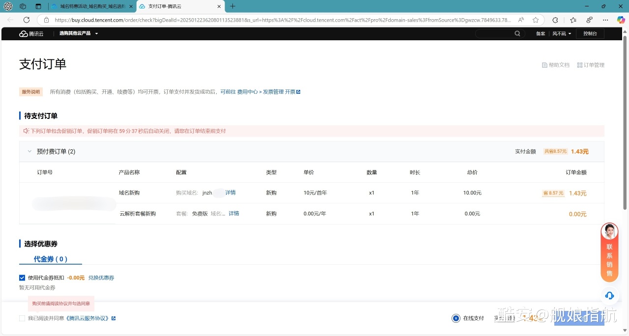 注册并实名制腾讯云,打开3.3.3域名购买链接: https://cloud.tencent.com/act/pro/domain-sales?from=19069 ,注意实名制需要身份证。下图是楼主购买的域名,花费1.43元。