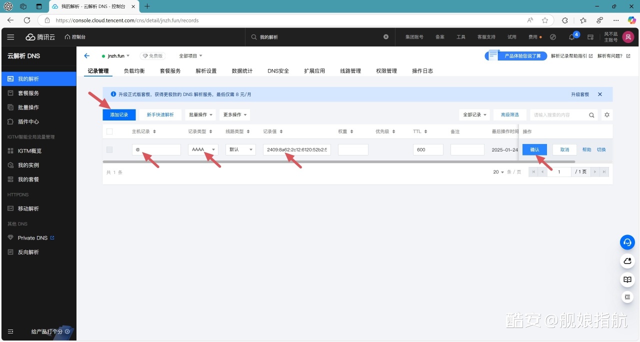 添加记录——主机记录填写@——记录类型选择AAAA——记录值填写本机IPv6地址——确认。