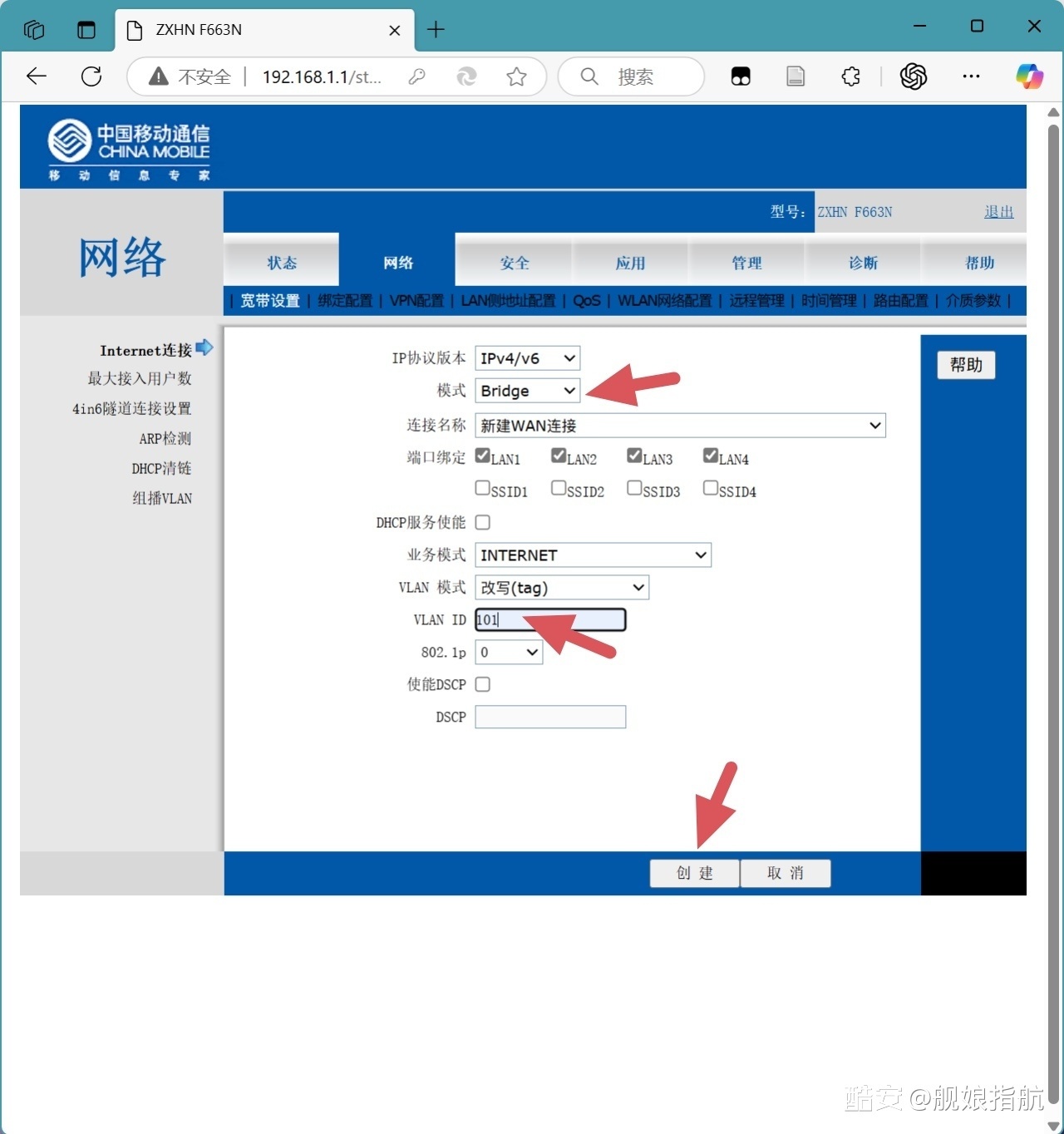 新建WAN连接——IP协议版本选IPv4/v6——模式选Bridge——端口根据自己情况绑定——业务模式选INTERNET——VLAN模式选改写(tag)——填写VLAN ID——创建。