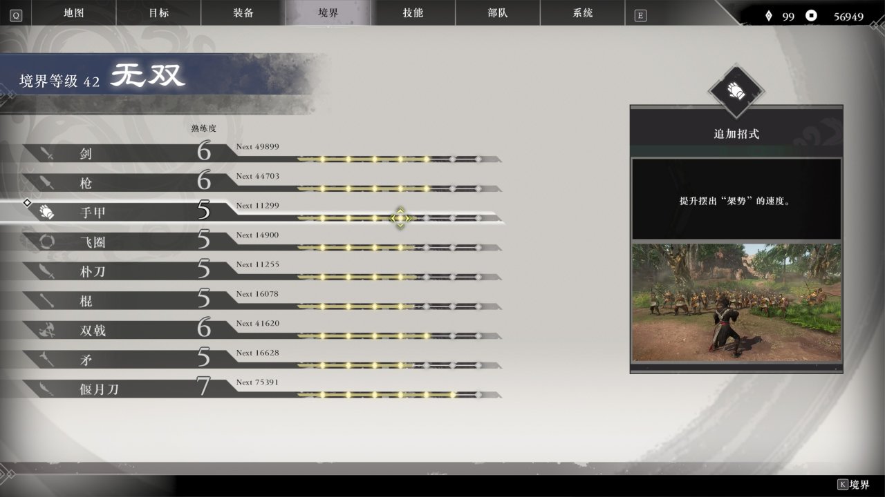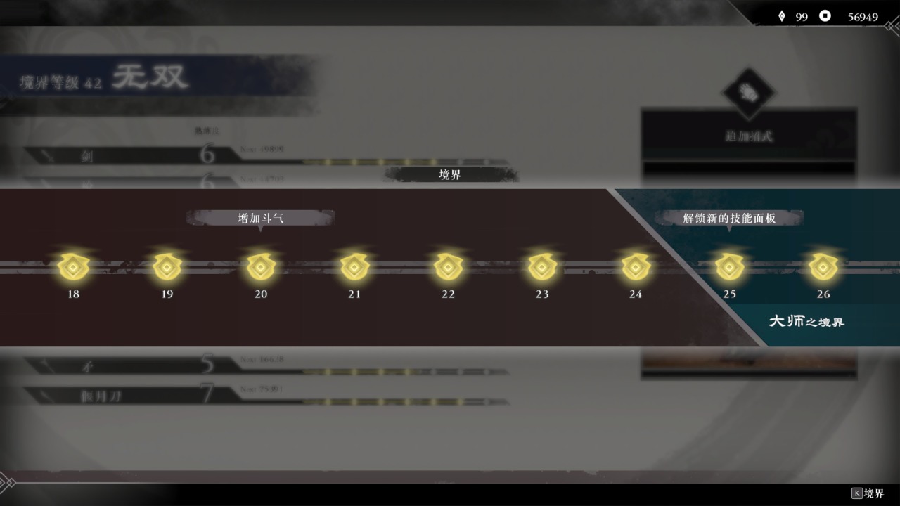 本作的人物成长机制,也与武器挂钩,武器的熟练度每达到一个等级便会提供一个境界点数,每点境界点数不仅会提供人物属性,并且达到某一节点后或是突破某一境界后,便会解锁当前境界的技能栏。