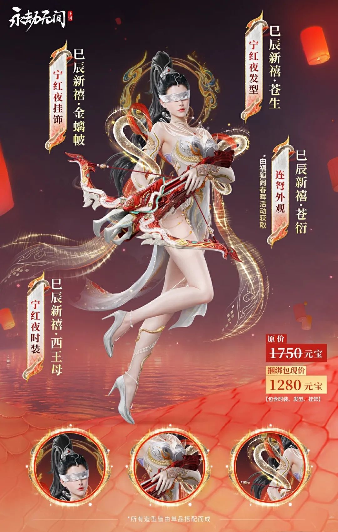 銀色旗袍修身,紅色披錦,金色飄帶,腰身紅金蛇紋鏤空雕花,更顯華光貴氣。