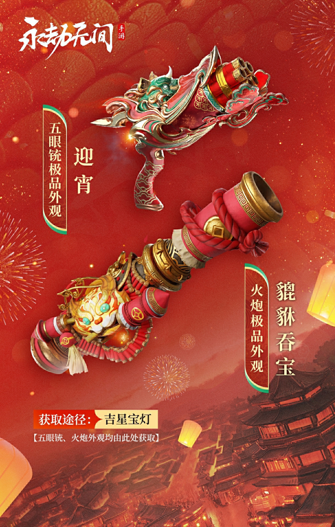 以爆竹作銃筒,祥瑞雲紋輔以裝飾,煙花於兩側綻放,辭舊迎新慶華年!