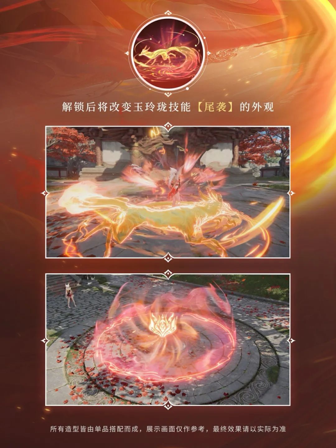純潔白狐着輕紗短裙,流光溢彩,高雅聖潔;妖媚赤狐佩火幔金飾,華麗尊貴,熠熠生輝。九尾龐龐,盡顯魅惑之姿。雙形態的變化更闡釋了玉玲瓏的鬼馬精靈與天通難料。