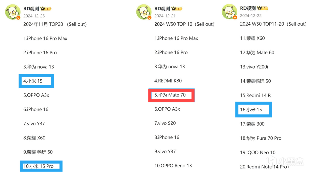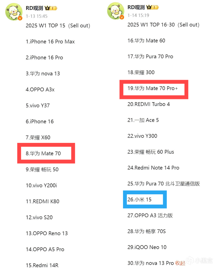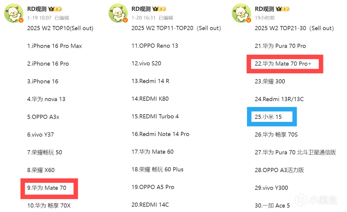 进入2025年,小米15系列继续下滑,掉到20-30名,小米15Pro前30名依然没有身影。华为这边,mate70系列2024年底50周开始进入前10,然后一直保持在前10,mate70Pro+随着供货的增加,销量也节节攀升,超越了小米15,远超小米15Pro。