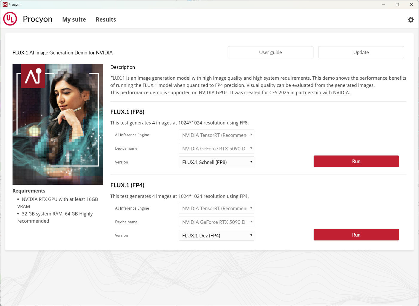 AIGC圖像生成環節。UL Procyon給GeForce RTX 50系列GPU提供了完整的測試基準,其中包括全新的FLUX.1 AI Image Generation Demo for NVIDIA。FLUX.1是一個機遇FP4兩話模型,擁有120億個圖像生成模型參數,因此對顯存要求也非常高,必須要在16GB顯存以上才能完成,意味着GeForce RTX 4090 D和GeForce RTX 5090 D以上這樣級別的GPU才能實現。