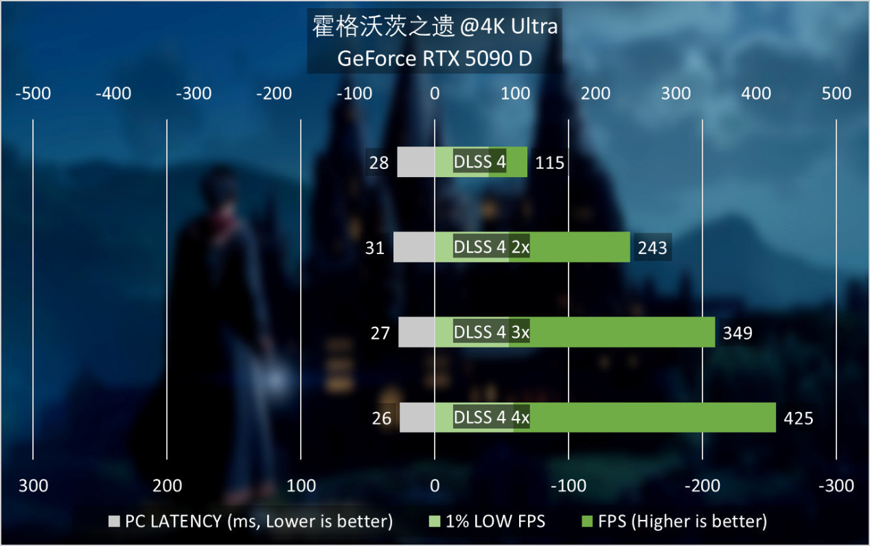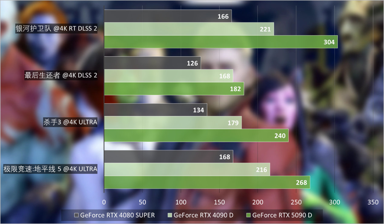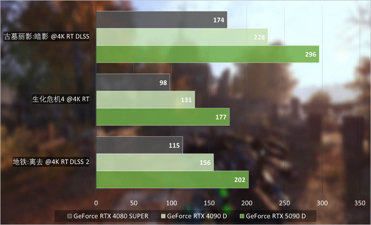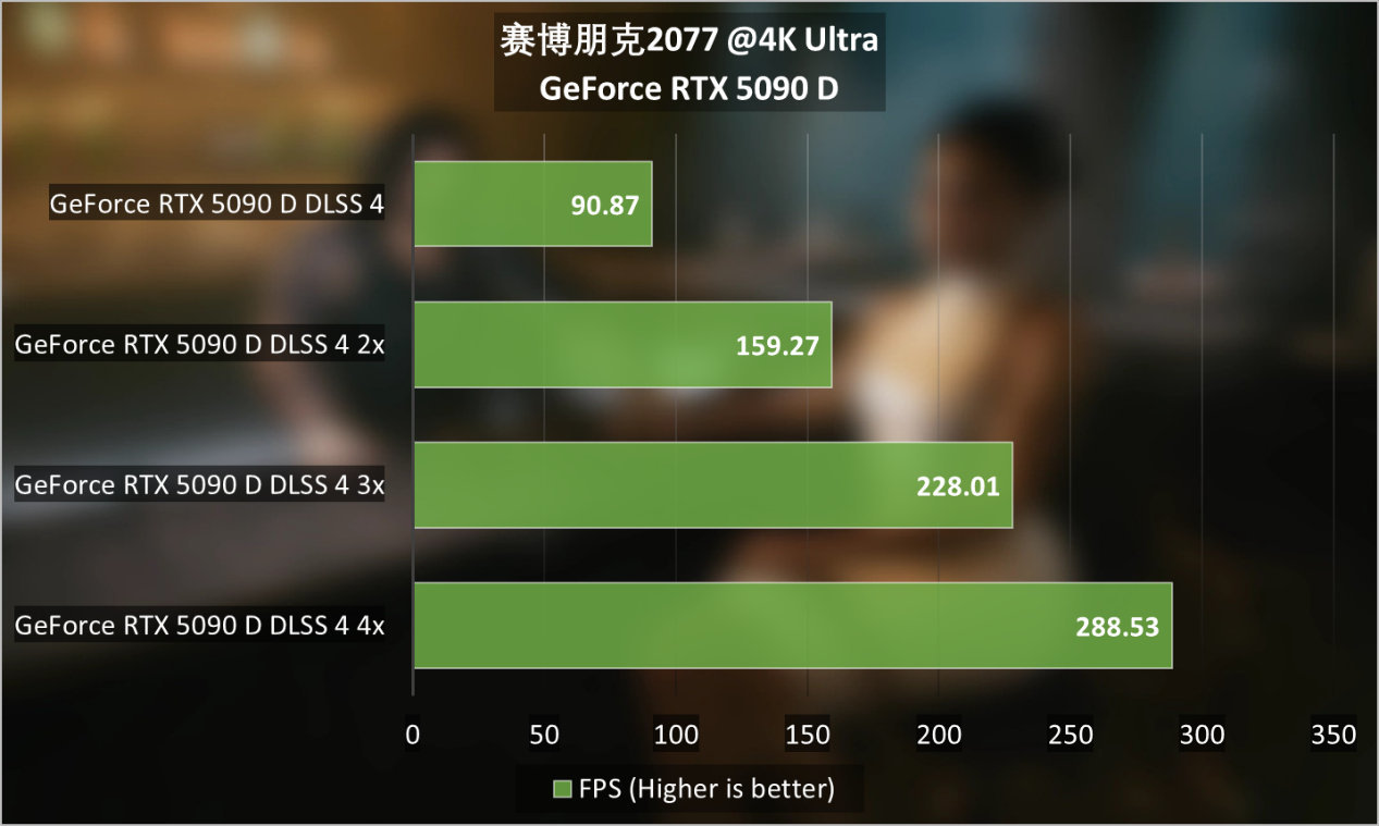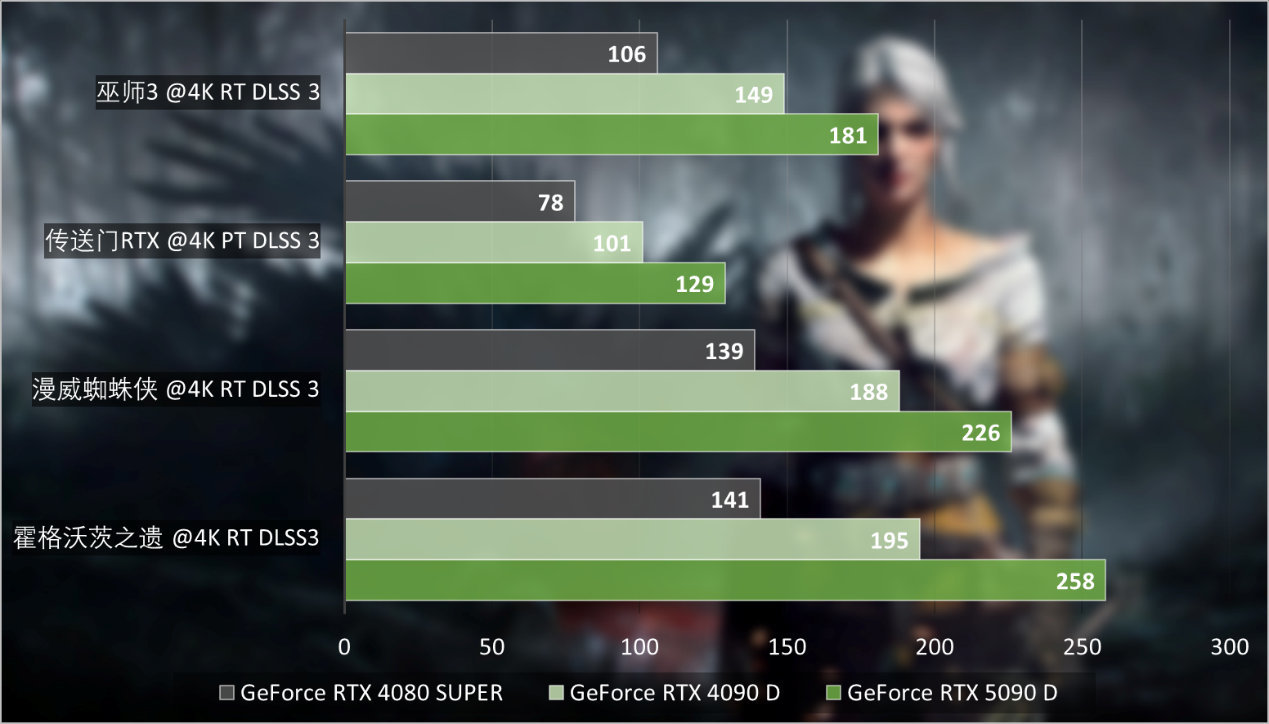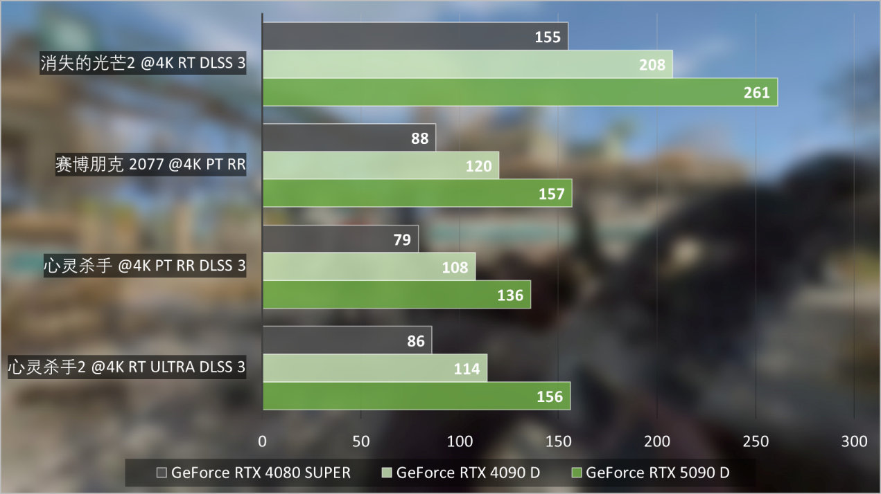 而在DLSS 3遊戲中,同樣是開啓4K最高畫質,並且開啓光線追蹤的前提下,GeForce RTX 5090 D相對GeForce RTX 4090 D提升20%到30%。但好戲纔剛剛開始,DLSS 4纔是GeForce RTX 5090 D真正發力的地方。