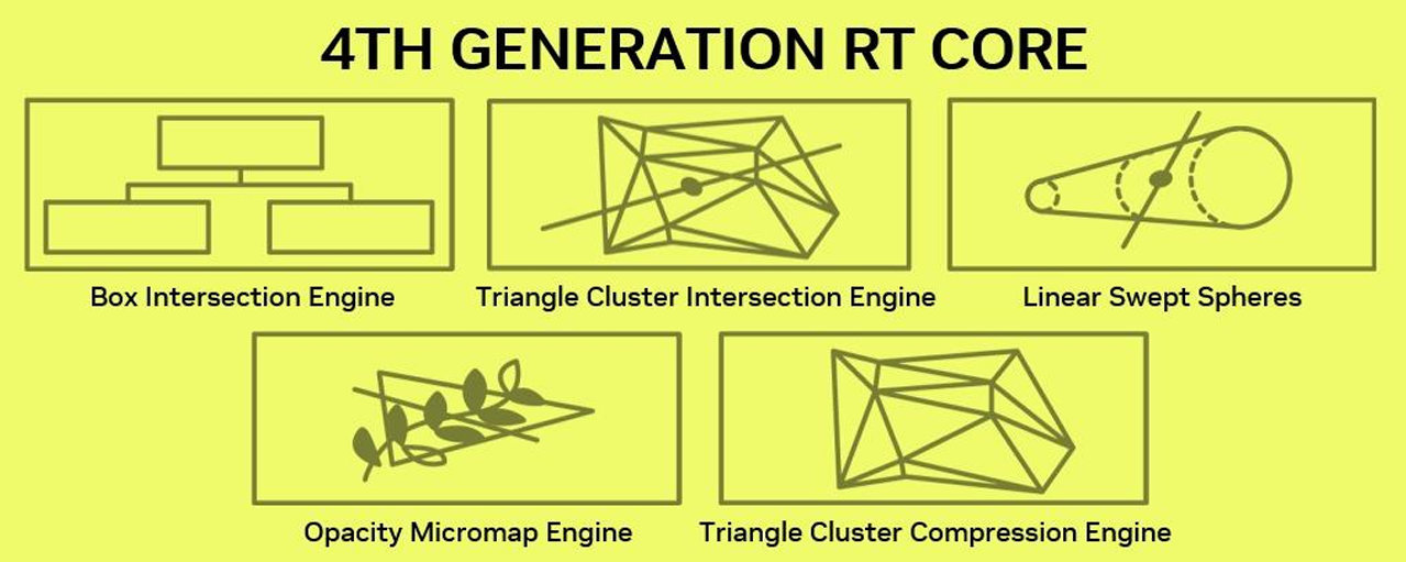 第四代RT Core則在第三代RT Core基礎上再次進行了調整,重點是獲得更高效的提供光線追蹤效果,以及更好的支持神經網絡渲染技術。除了加速Alpha測試判斷物體表面是否可見或者透明的Opacity MicroMaps引之外,還包括一個三角形簇相交引擎(Triangle Cluster Intersection Engine),爲全新的Mega Geometry技術加速三角形簇級結構的光線追蹤,同時也兼顧常規的光線與三角形相交測試。Mega Geometry技術旨在光線追蹤應用中大幅提升幾何細節。