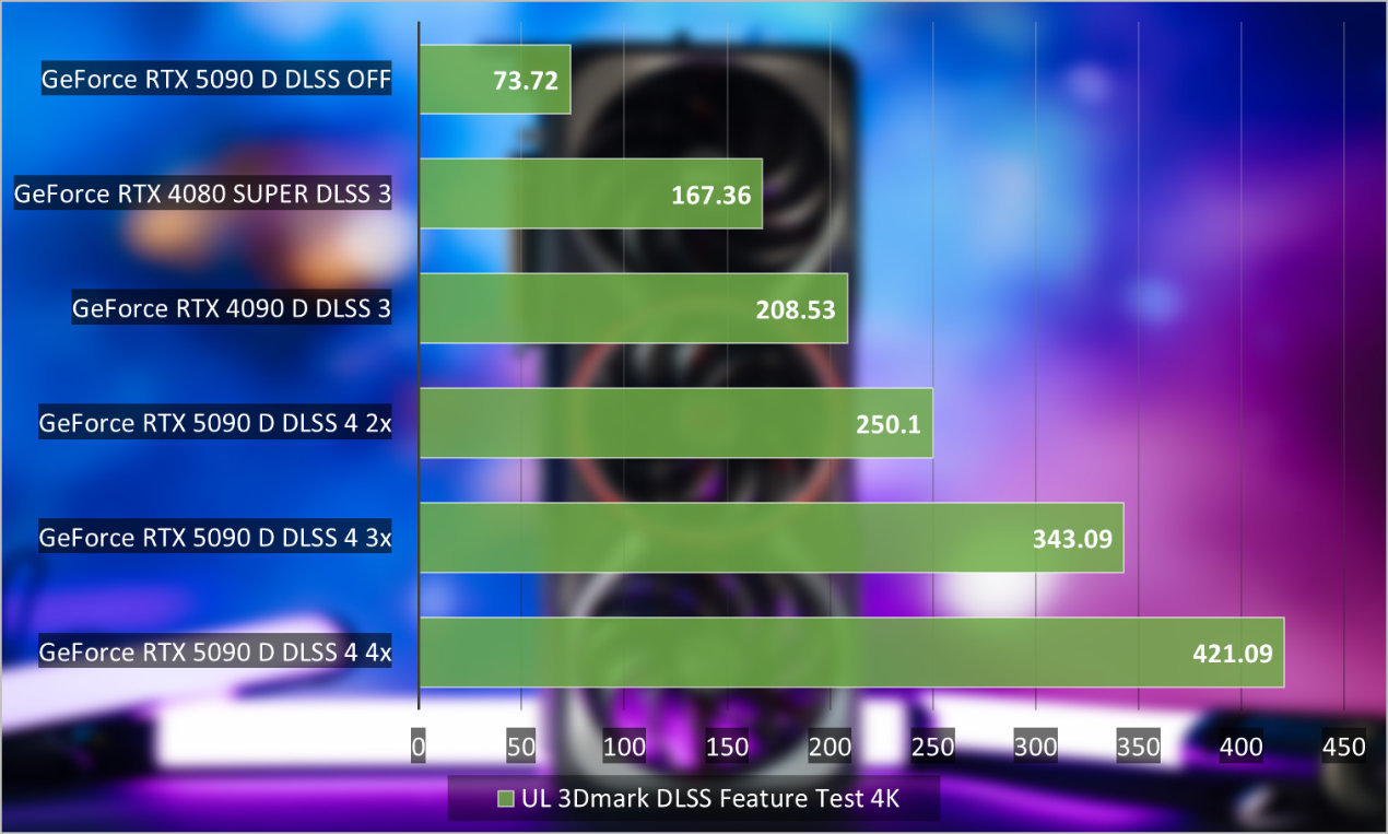 UL 3Dmark DLSS Feature Test項目中,已經在預覽內提供了對DLSS 4的支持,在後續升級中,正式版也會提供對DLSS 4的測試。這裏我們順帶引入了RTX 4090 D的對比,同樣的場景下GeForce RTX 5090 D相對RTX 4090 D提升了一倍有餘。同樣,相對不開啓DLSS 4的原生畫面,提升更爲誇張,達到了將近5倍。