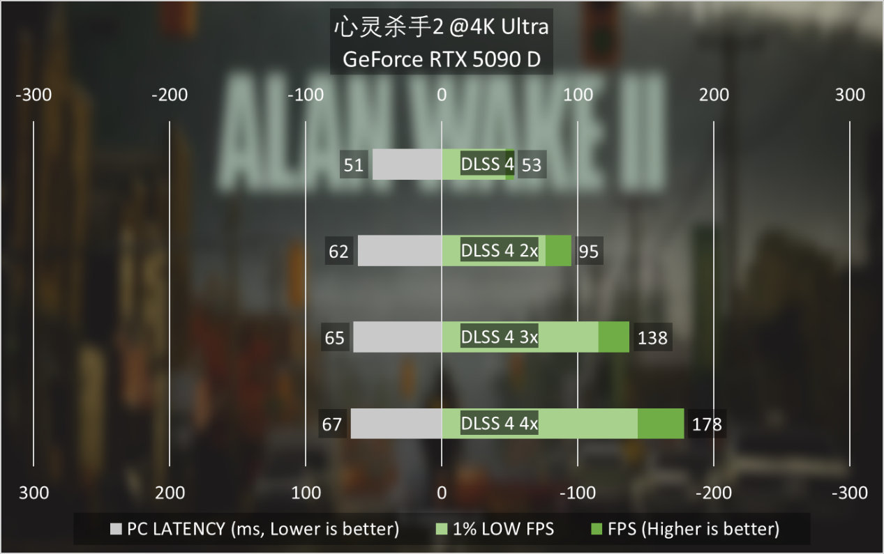 在幀率上的表現意識如此,在遊戲設置中可以直接看到DLSS下提供2X到4X的幀生成選項。如果開啓DLSS 4 4X,最高畫質且開啓光線追蹤,在4K分辨率下可以獲得178FPS的平局值,是不開啓幀生成的3.3倍。
