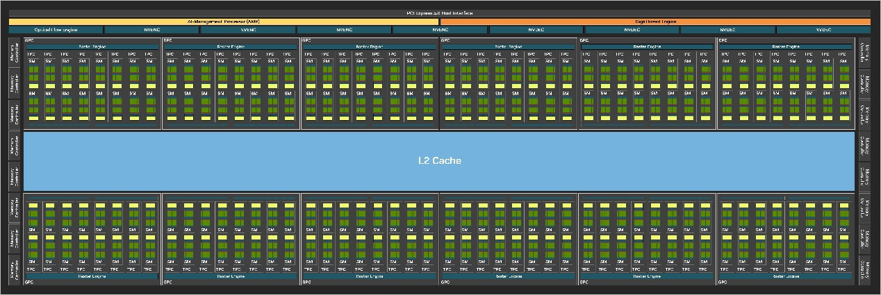 完整的GB202 GPU包括12個GPC(Graphics Processing Clusters,圖形處理集羣),96個TPC(Texture Processing Clusters,紋理處理集羣),192個SM(Streaming Multiprocessors,流式多處理器),以及1個512-bit內存接口,配備有16個32-bit內存控制器,用於對顯存進行控制。
