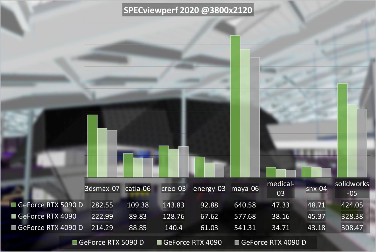 SPECviewperf用來考驗OpenGL和Direct X API的3D圖形性能,測試場景包括3dsmax、Catia、Creo、Energy、Maya、Medical、SNX、Solidworks。GeForce RTX 5090 D相對GeForce RTX 4090 D提升有30%到50%。