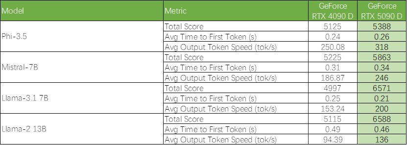 然後是UL Procyon AI文本生成基準測試,在測試中動用了多個大語言模型LLMs作爲AI性能評估,包括Phi-3.5-mini-3.8B,Mistral-7B-v0.2 7B,Llama -3.1 8B,Llama-2 13B。可以看到。GeForce RTX 5090 D表現也明顯優於GeForce RTX 4090 D,部分場景可以有44%的提升。