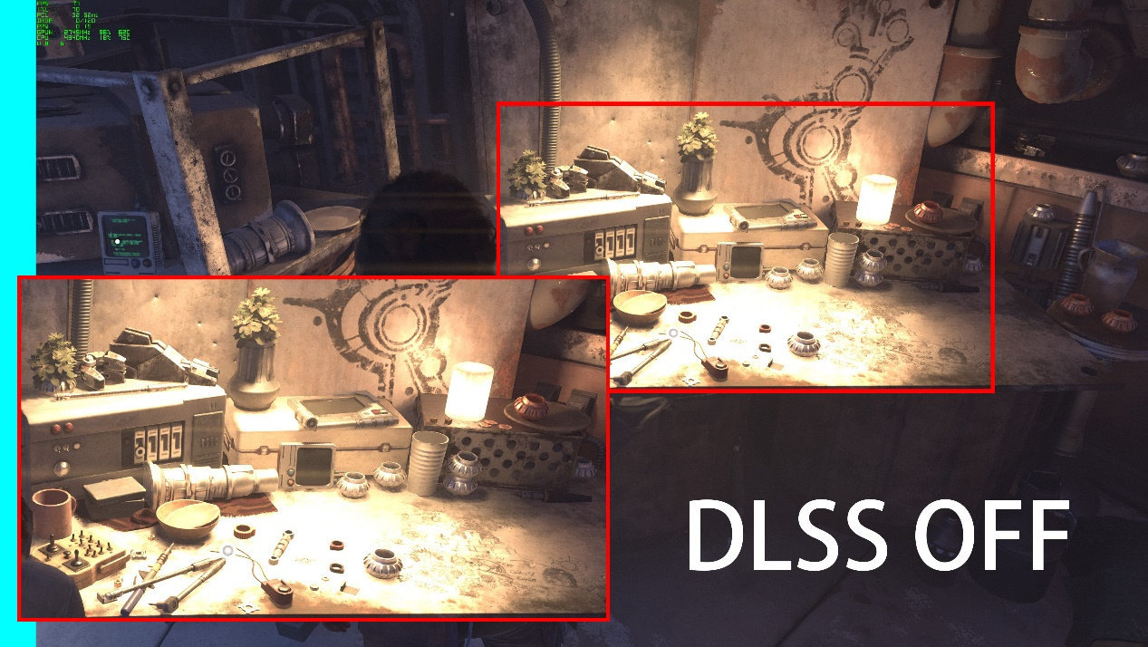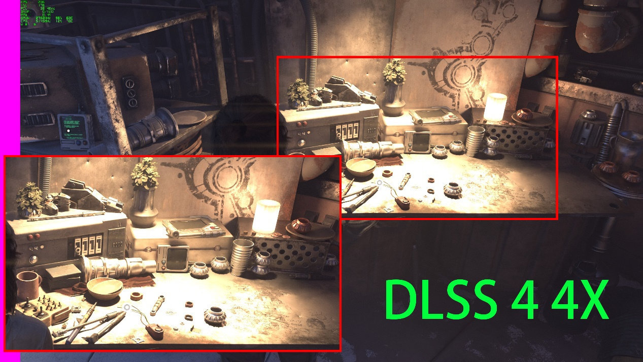 有意思的是,開啓DLSS 4和關閉DLSS 4使用最初的原生畫質作比較,DLSS 4讓桌面物品顯得更爲清晰。