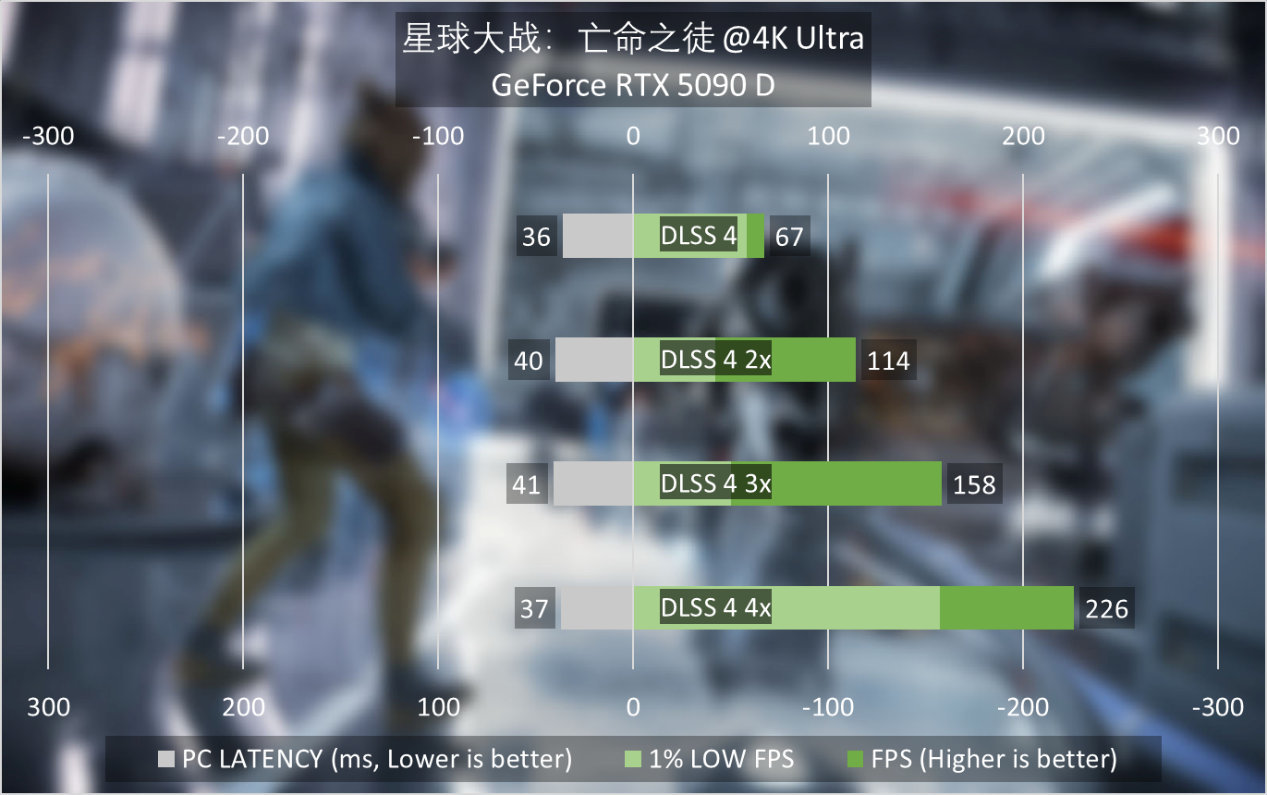 這裏我們分別開啓作爲參考,可以看到當開到4X的時候,在4K分辨率最高畫質且開啓光線追蹤的前提下,能夠輕鬆獲得226FPS的平均幀率,是不開啓幀生成的3.3倍。同時系統響應速度維持在同一水平。