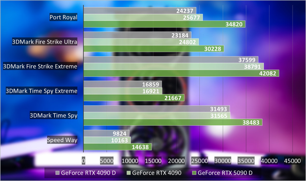 按照慣例,先進行基準測試,包括DirectX 11和DirectX 12性能的3DMark Time Spy,3DMark Time Spy Extreme,3DMark Fire Strike Extreme,3DMark Fire Strike Ultra,Port Royal,基礎性能上,GeForce RTX 5090 D相對GeForce RTX 4090 D提升28%到50%。