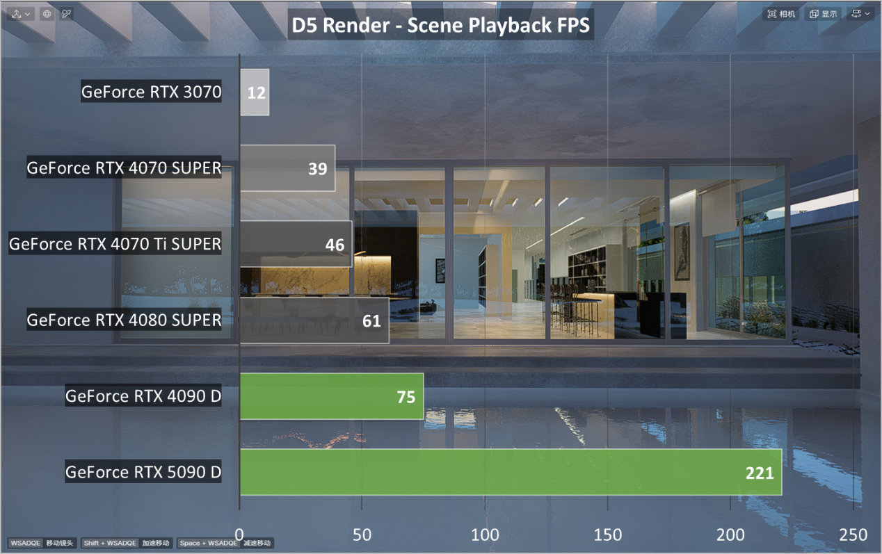 這裏我們使用同一個場景對數款GPU進行了對比測試,在同一場景下,開啓DLSS 4X多幀生成後,幀率一下猛增至於221FPS,對應的GeForce RTX 4090 D只能做到75FPS,差距非常巨大。