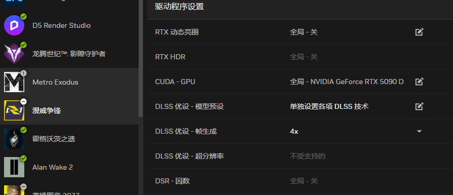另外有兩款有意思的遊戲已經提供了對NVIDIA App的支持,在遊戲運行前就能把對應的理想設置準備好。其中一款是已經上市的網易遊戲《漫威爭鋒》。在NVIDIA APP的遊戲設置中,就能找到DLSS Override選項,可以直接對分辨率超採樣,幀生成進行調整。