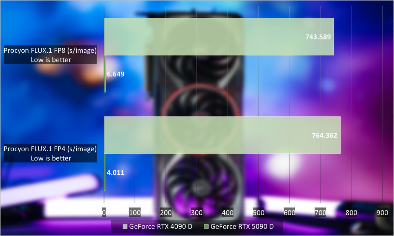 這裏我們分別對Procyon FLUX.1 FP4和Procyon FLUX.1 FP8進行對比,檢測GeForce RTX 4090 D和GeForce RTX 5090 D生成每張圖像所花費的時間,由於GeForce RTX 5090 D原生支持FP4,差距一下就拉開了,比GeForce RTX 4090 D快了將近190倍。