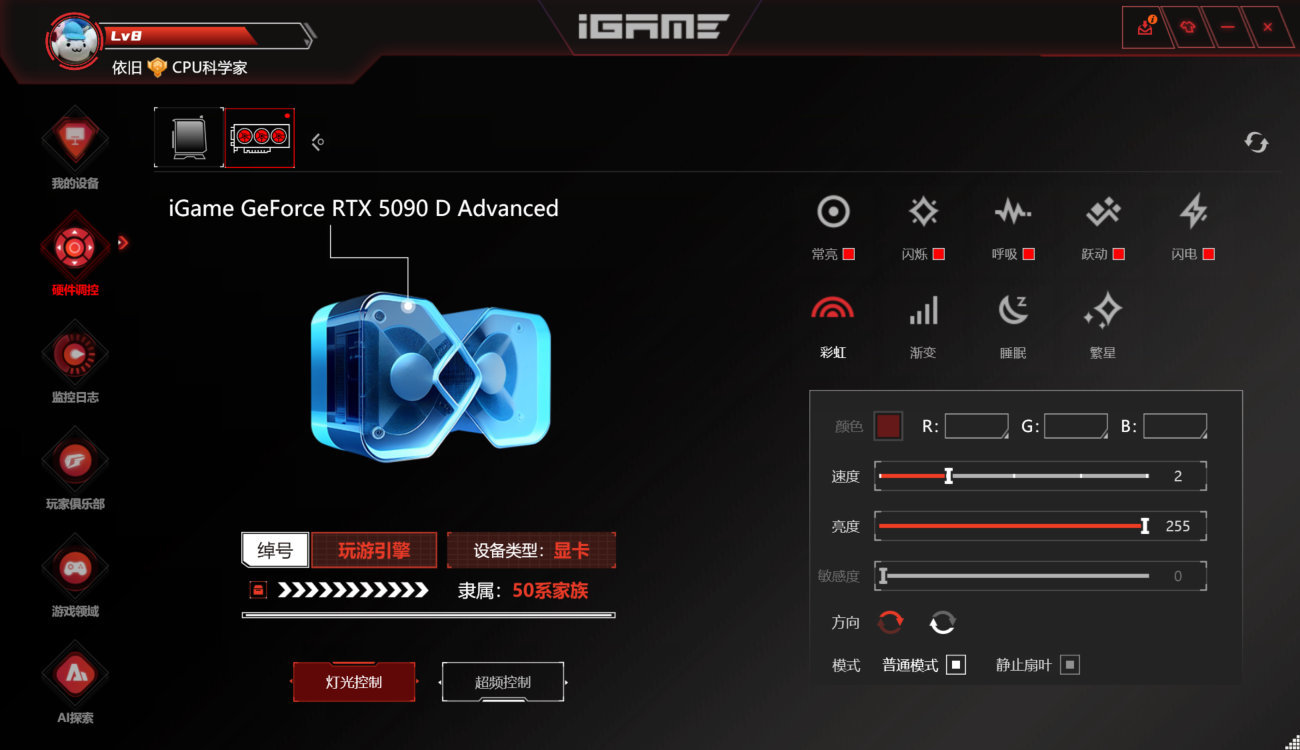 iGame Center本身提供了豐富的功能,包括對顯卡的呼吸燈進行調教,配合一鍵切換vBIOS的物理按鍵,玩家也可以後續通過超頻控制進一步壓榨手裏GeForce RTX 5090 D的極限性能。