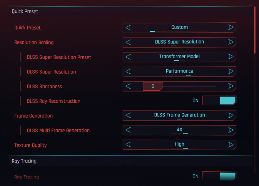 《賽博朋克2077》也已經宣佈了對DLSS 4的支持,遊戲設置部分可以找到DLSS Super Resolution的選項,並且已經能夠開啓Transformer模式,意味着GeForce RTX 50系列以前的RTX GPU也能從中受益。