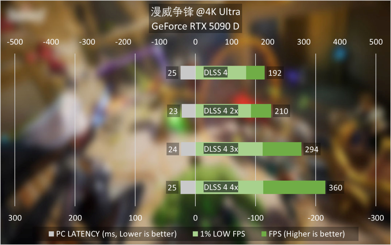 作爲一款快節奏第一人稱對戰遊戲,GeForce RTX 5090 D在《漫威爭鋒》上的表現很理想,開啓DLSS 4後,4K最高畫質下幀率達到360FPS,系統響應延遲僅僅爲25ms。