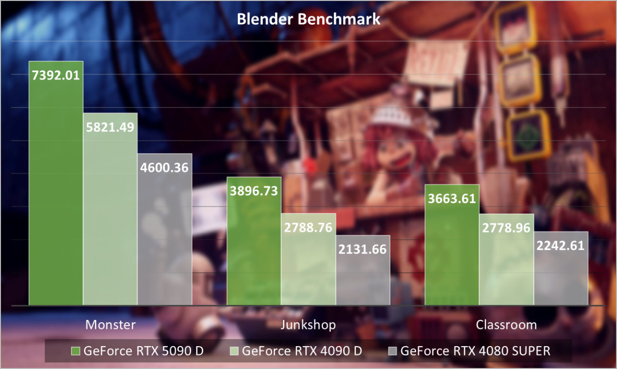 傳統的內容創作環節。Blender Benchmark 4.3.0引入的Moster、Junkshop、Classroom三個參考場景作爲參考。GeForce RTX 5090 D同樣有明顯的提升,相對GeForce RTX 4090 D提升幅度在20%到40%。