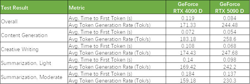 最後是MLPerf-Client v0.5。MLPerf是由MLCommons聯盟開發的機器學習基準測試,成員來自哈佛大學、斯坦福大學、NVIDIA、谷歌的工程師和研究人員,旨在不同平臺下探討GPU的AI性能釋放,LLMs大語言模型正好是其中之一。這裏MLPerf-client使用Meta的Llama2-7B模型進行。可以看到GeForce RTX 5090 D處理Llama2-7B模型的速度幾乎是GeForce RTX 4090 D的2倍。