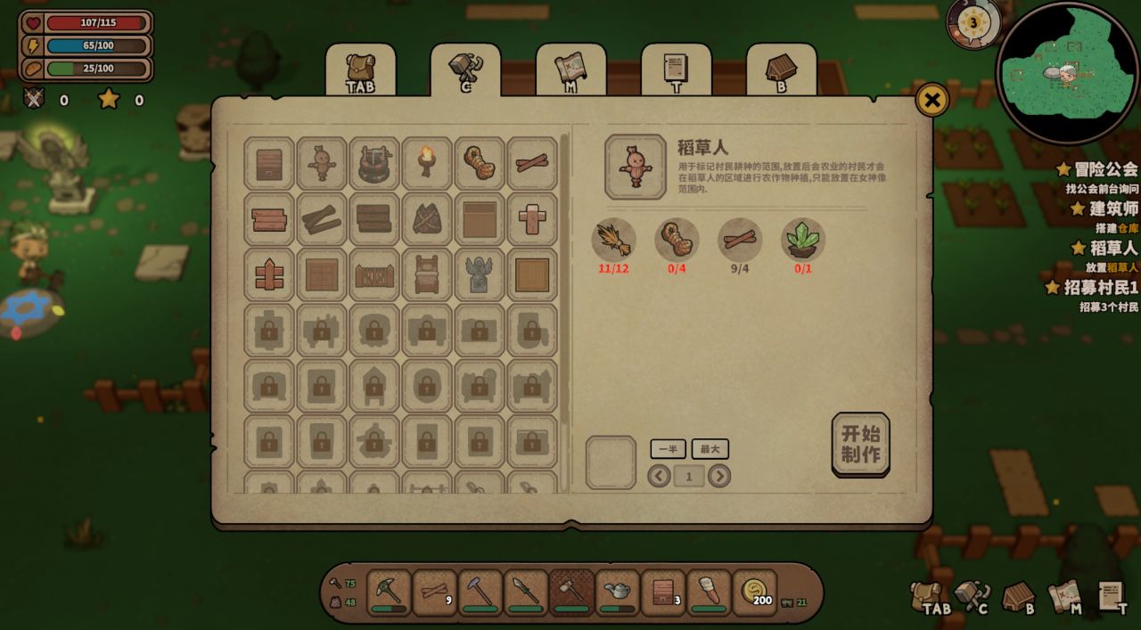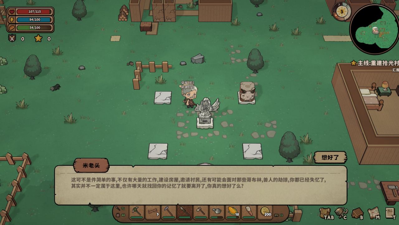 但《拾光物语》给我的最大感受就是它非常轻量化。比如前期修复一个女神像只需十块石头,而建造一个稻草人也只需要消耗木头、石头和杂草,简单制作几个绳子、木棍以及一个结晶即可完成。游戏中不需要挖掘太多材料,因此与其他生存游戏相比,前期所需的建造材料相对较少。在一个下午的时间里,就能轻松将主线进度推进到中期阶段。而且,生存压力也小,非常轻度的生存战斗体验。