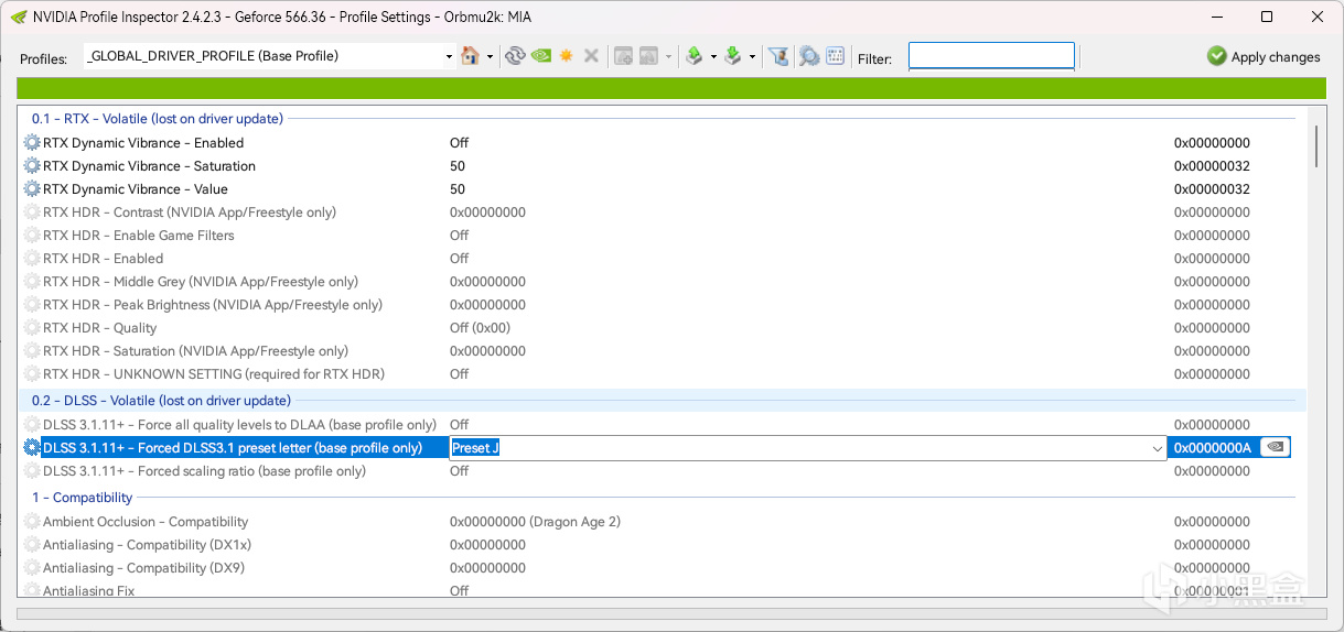 打開NVIDIA Profile Inspector軟件,修改Forced DLSS3.1 Preset Letter爲Preset J,點擊Apply Changes,關閉軟件打開遊戲即可生效