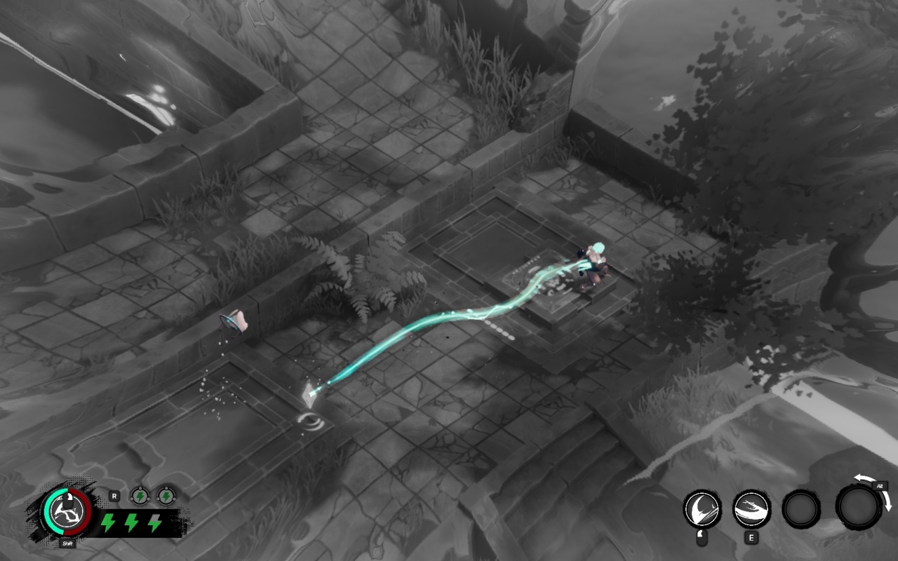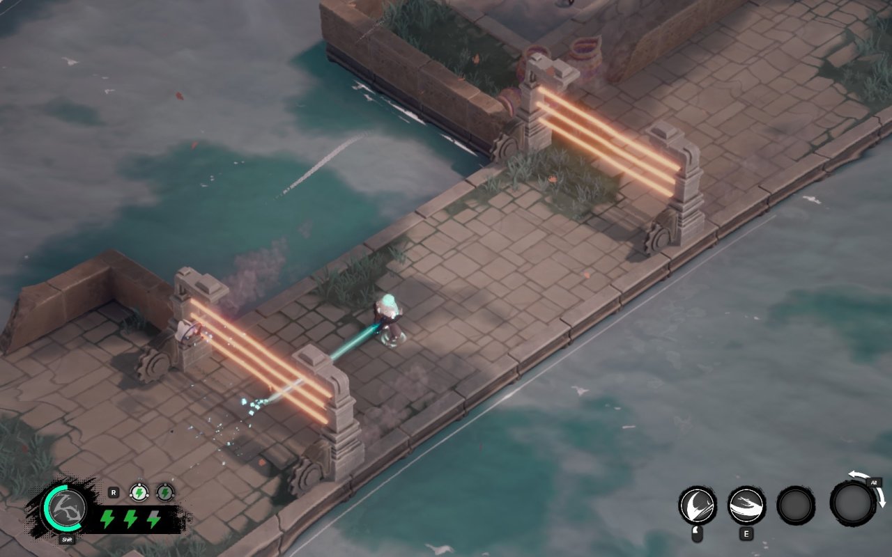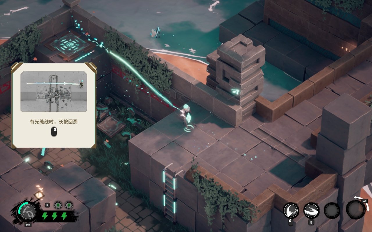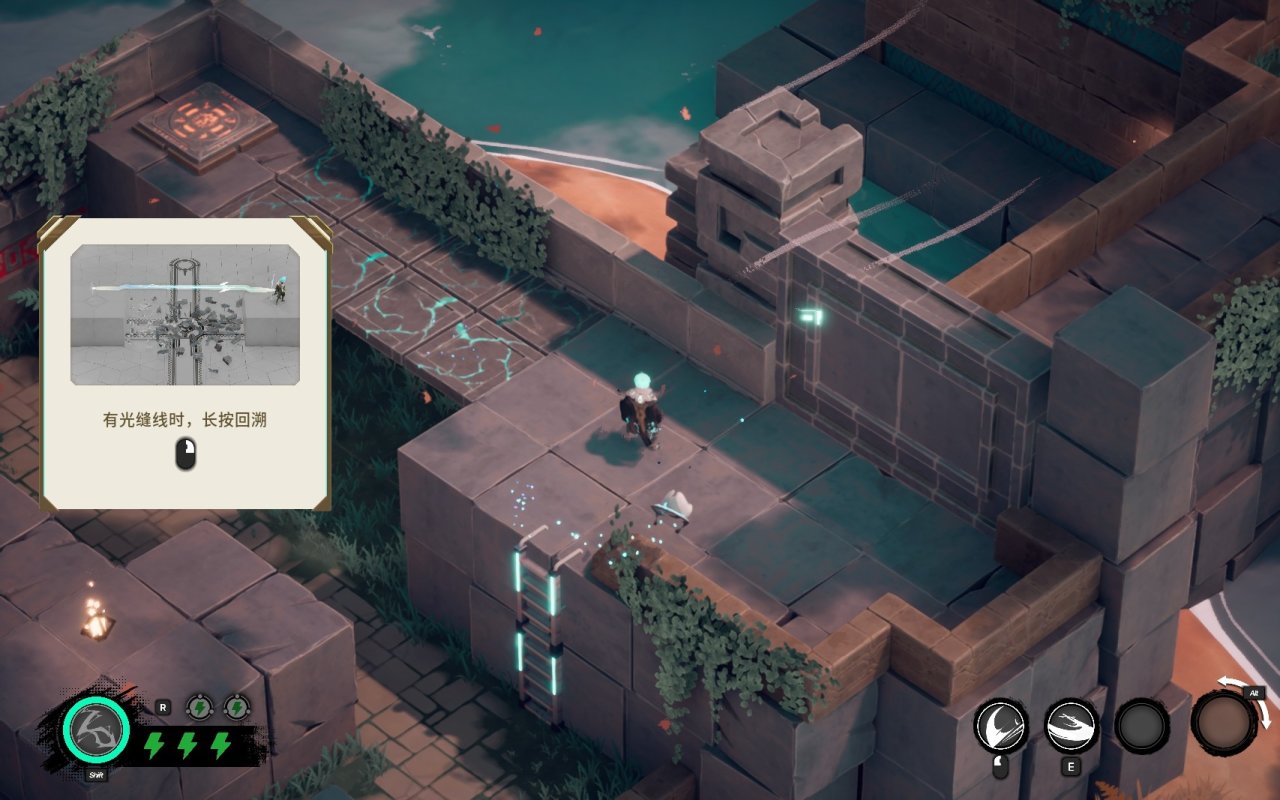 这个就是游戏最具创意的地方了,这个机制在给我介绍并第一次使用的时候,我就想起了一个游戏中的人物,那就是《英雄联盟》中的艾克,他一样有回溯这个机制,通过行进而留下的路径进行回溯,回到最后路径最后滞留的位置。