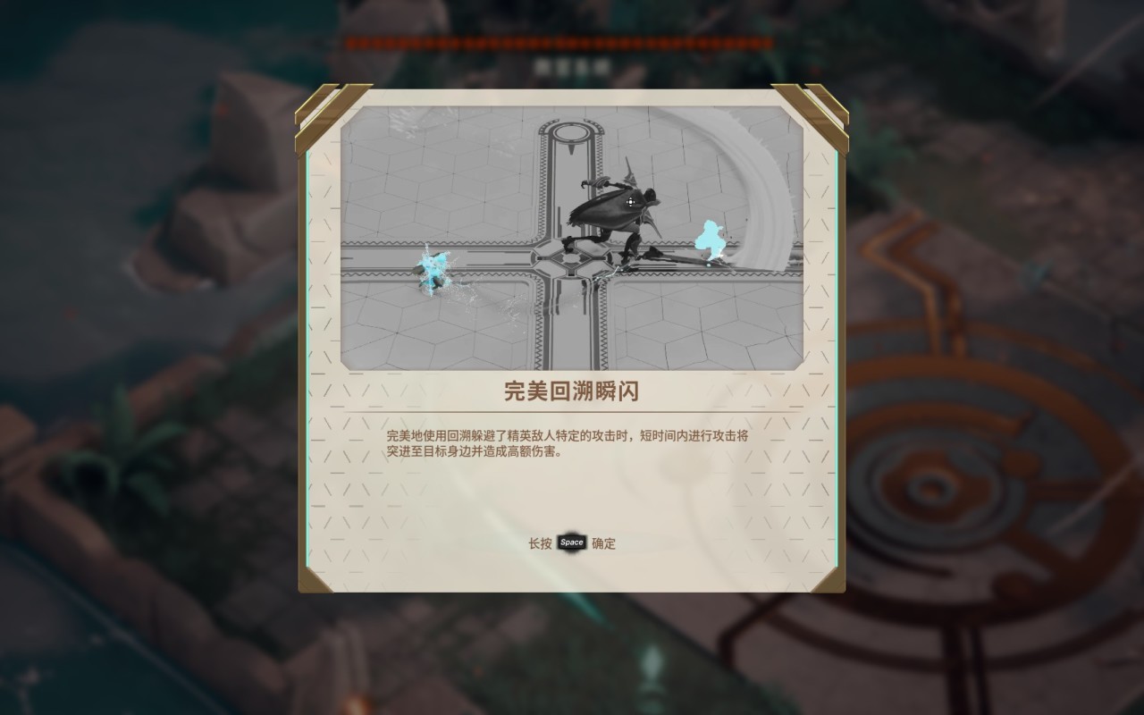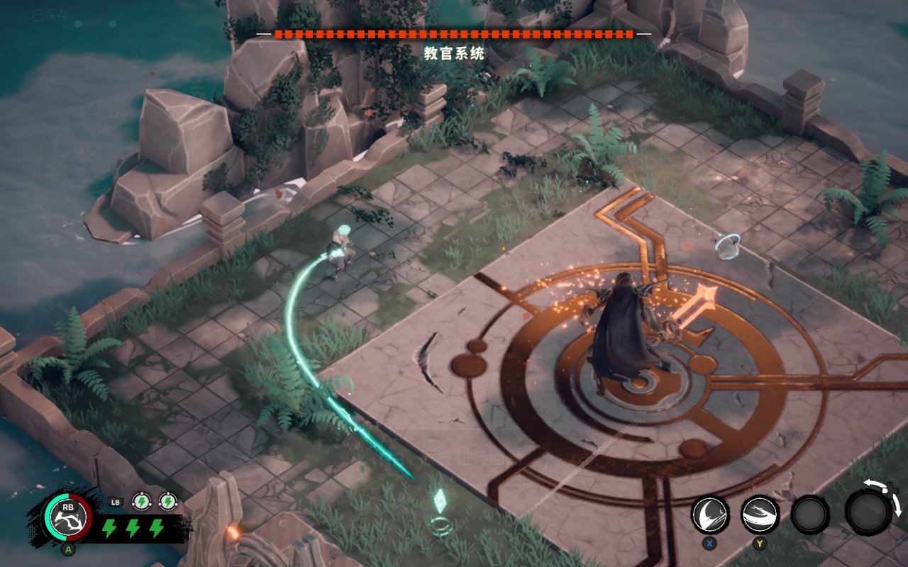 可以说做出一种创新,在独立游戏这里,而且回溯这一点可以主要用于游戏中的解密方面,就比如我说的踩机关,再回到通道门口前进。还有就是与战斗的结合,碰到一些AOE范围大的攻击,可以选择使用回溯进行躲避,这样效果好,而且还可以背刺你的敌人的,比如这个BOSS,范围相当大,而且二阶段还会举盾,就需要拉扯,然后结合着回溯攻击。