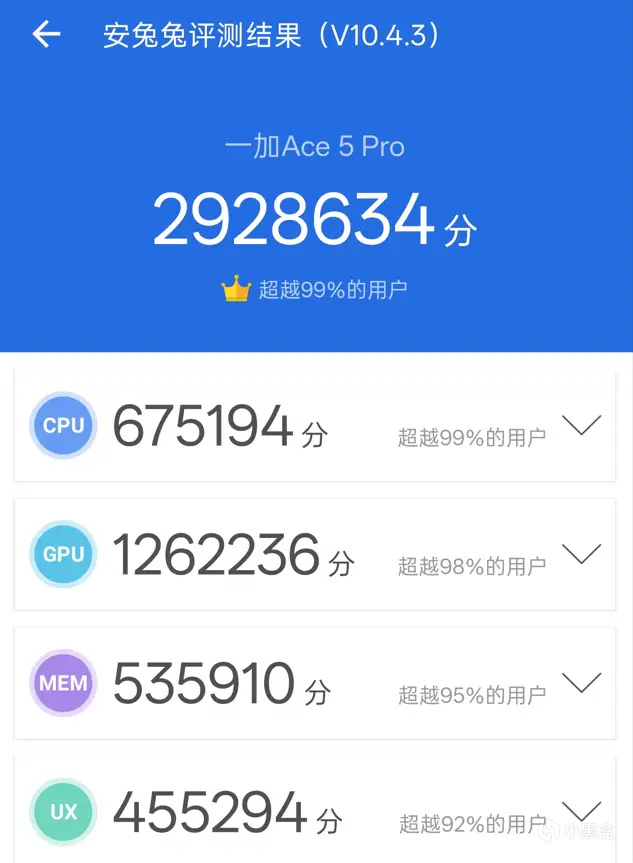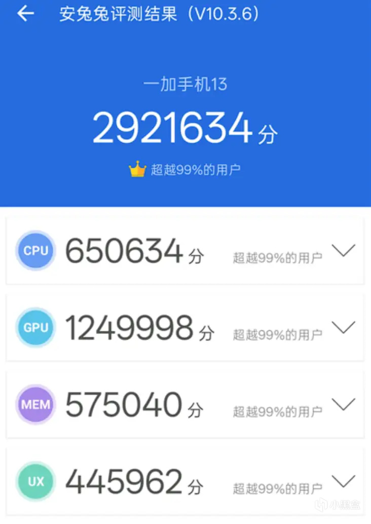 ▲这里咱们不废话,先说手机性能,一加13的安兔兔实测跑分高达292万分,虽然比不上一加给出的实验室数据,但是也是非常高了,安兔兔也说这个跑分超越了99%的用户。