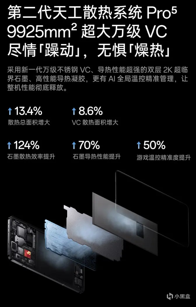 ▲另外,为了实现性能的满血释放,一加13还搭载了全新升级的第二代天工散热系统Pro,拥有9925mm²超大散热面积,同时行业首发双层2K超临界导热石墨,导热系数行业领先,散热效率提升124%。同时,一加13中还首次落地了新一代AI自研温控算法,匹配14颗温度检测传感器,游戏温控精准度提升50%,护航超Pro性能持久稳定释放。