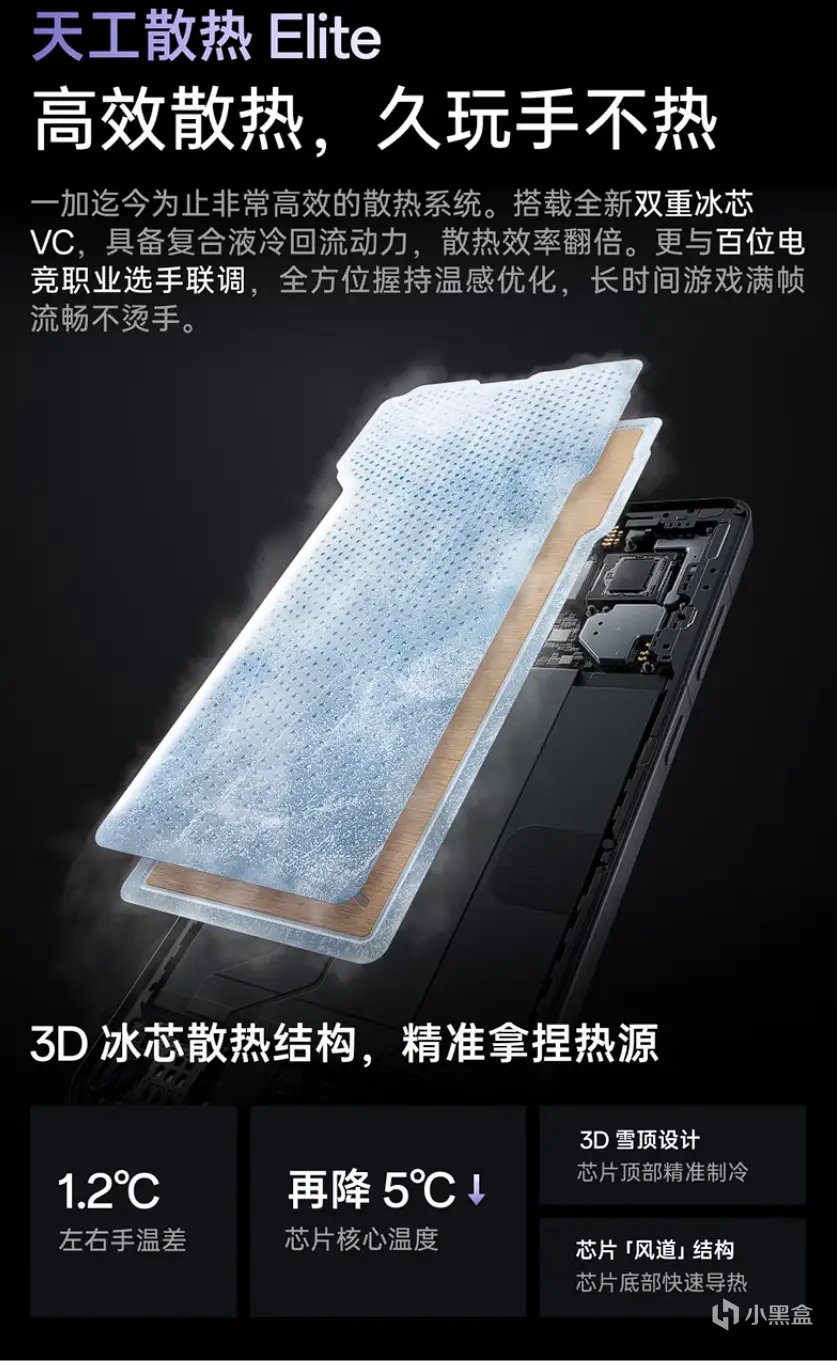 ▲在散热方面,一加Ace 5 Pro 搭载了天工散热Elite系统,这款散热系统专为游戏玩家设计,不仅能实现手机性能的满血释放,同时得益于与百位电竞职业选手的联合调校,手机的握持与操控部分更是非常凉爽,让玩家在长期酣战后依旧不会感到烫手。