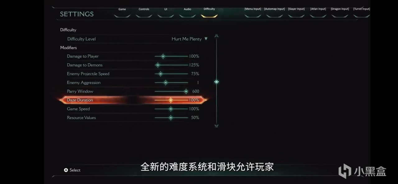 来到最后自然是最新的自定义难度。和其他游戏粗暴的分为简单困难不同,《黑暗时代》可以自己设定更多而且独属于自己的定制功能。包括敌人攻击速度和游戏整体节奏等,玩家可以自由设置敌方的射弹速度、眩晕时长、格挡的时机以及资源值。