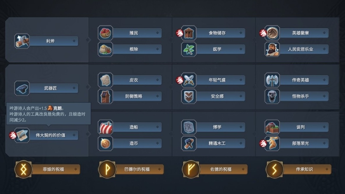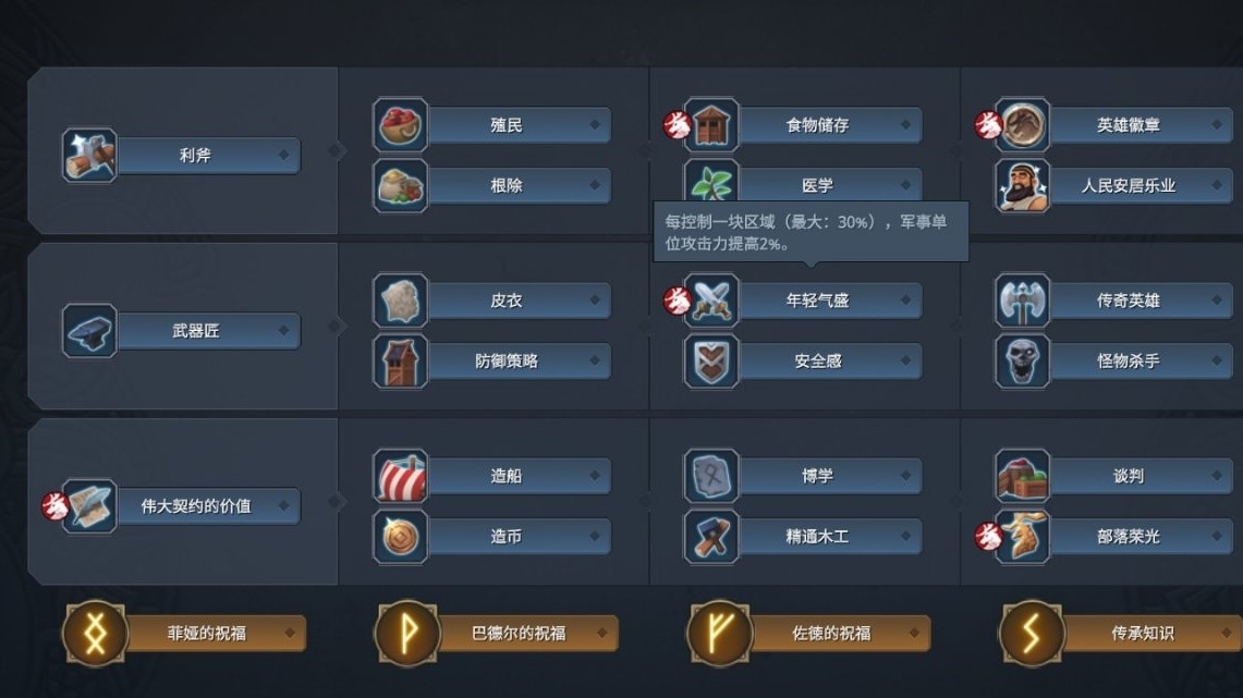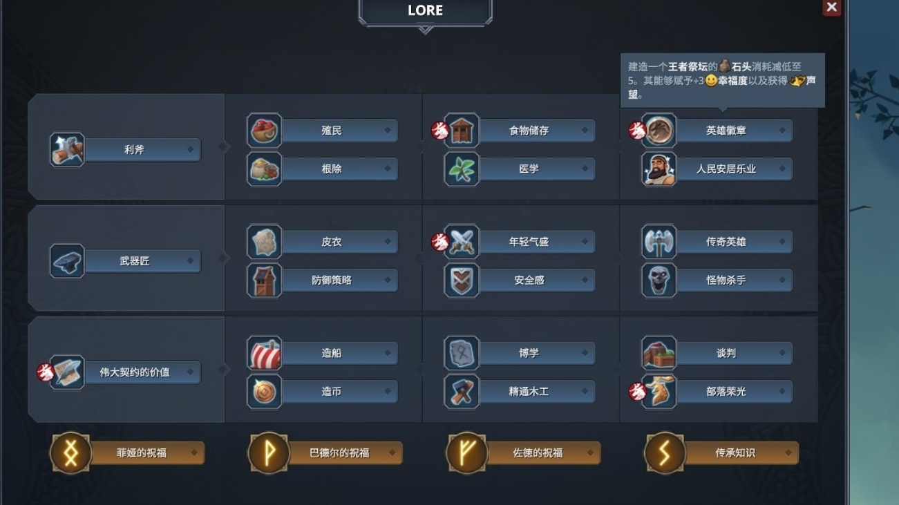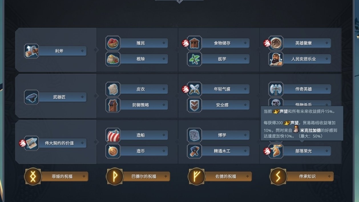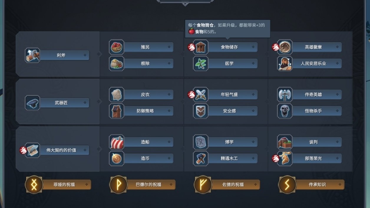 征服路線:利斧—殖民/根除—偉大契約—食物儲存—造船/造幣—武器匠—皮衣—年輕氣盛—傳奇英雄—安全感