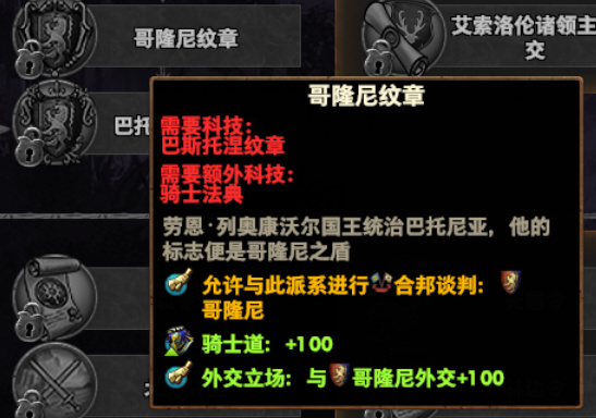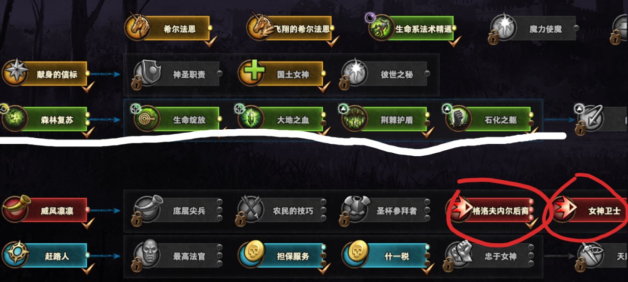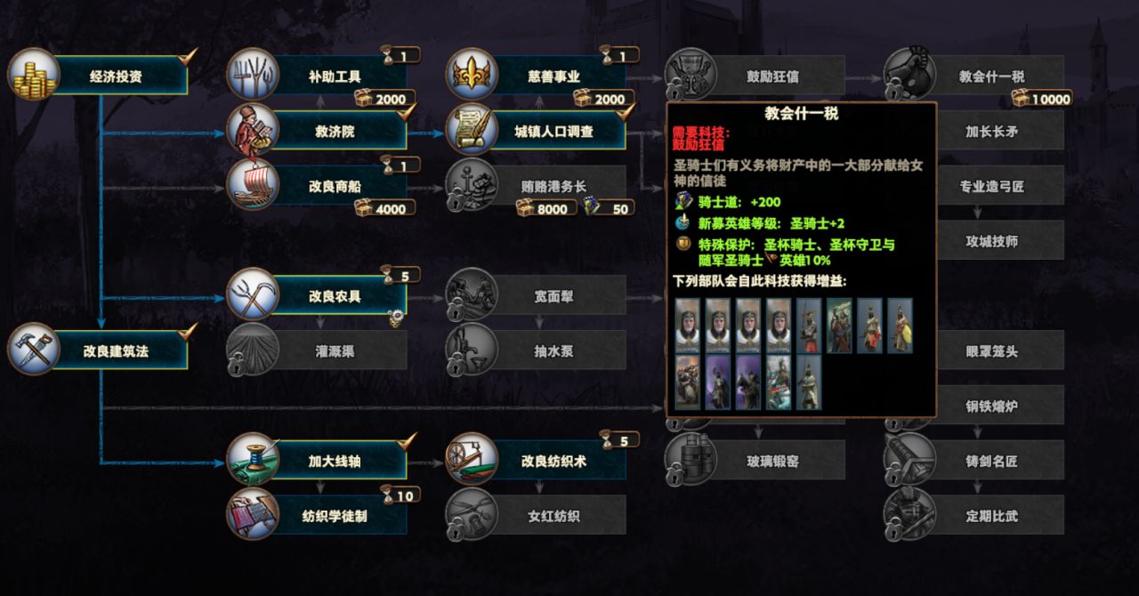 合邦科技我就不点了,除非是玩【劳恩国王】这次就从右边的两条经济线开始点。经济线包含了部队招募容量和各种增益,所以前期还是挺实用的。