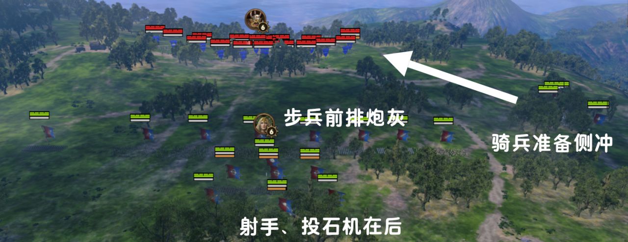 步兵列阵接敌,再用骑兵侧冲或背冲,可冲散后排射手