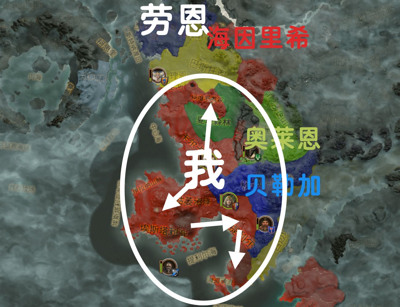 后面可以北上灭掉【海因里希】或者东征【贝勒加】都可以。合邦科技差不多也可以点了,顺便把劳恩收入麾下。