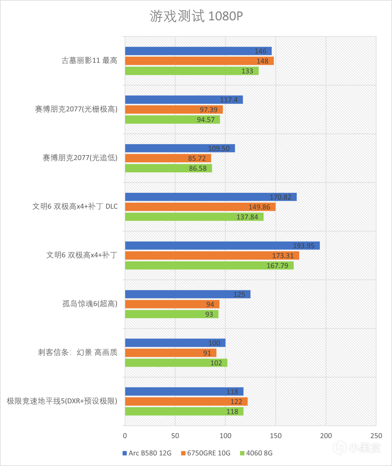 其他游戏的测试结果如下,可以看出Arc B580这个显卡还是比较吃优化的,优化好的游戏上吊锤4060和6750GRE,其他优化一般的就是堪堪平手。整体来看有的平有的赢,Arc B580 index下黁略大,12GB也能适应更高分辨率的情况。不过从价格上来说,大家都是2000块,能买到同等性能的显卡是我的预期,某些游戏能秒杀那就是超预期,所以还是值回卡价的