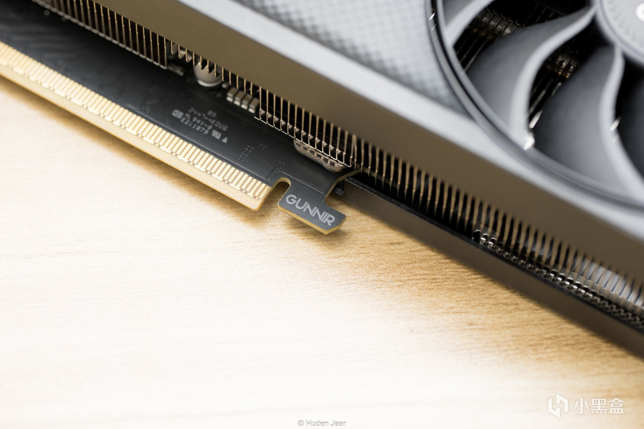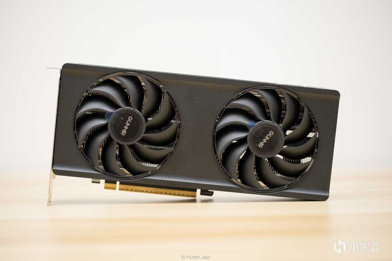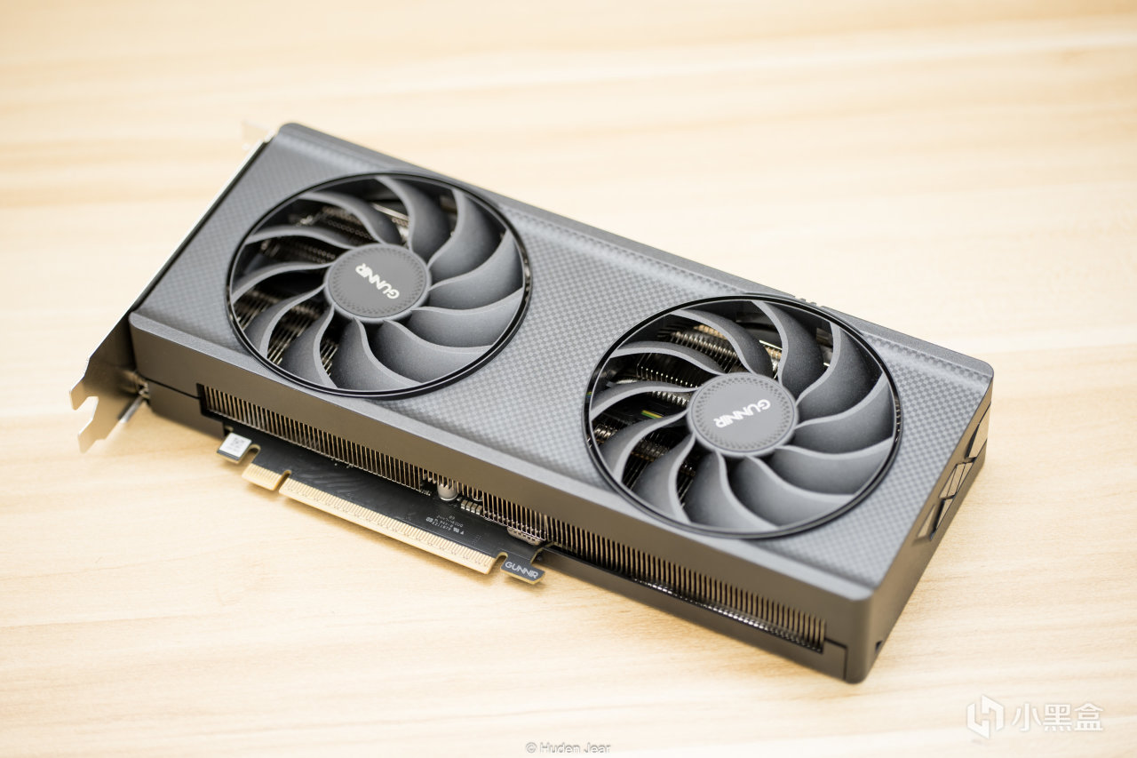 显卡正面上没什么装饰,算是弱项之一,外壳上有碳纤维状的图案,PCB上有一个gunnir的标志,显卡末端有几个方形的纹饰。受到某些逆天非公显卡影响,我现在对外观要求的接受度究极高,够简约已经是很不错的显卡了,所以看着Arc B580 Index甚至觉得十分乃至九分的好看