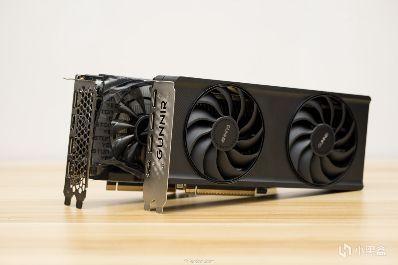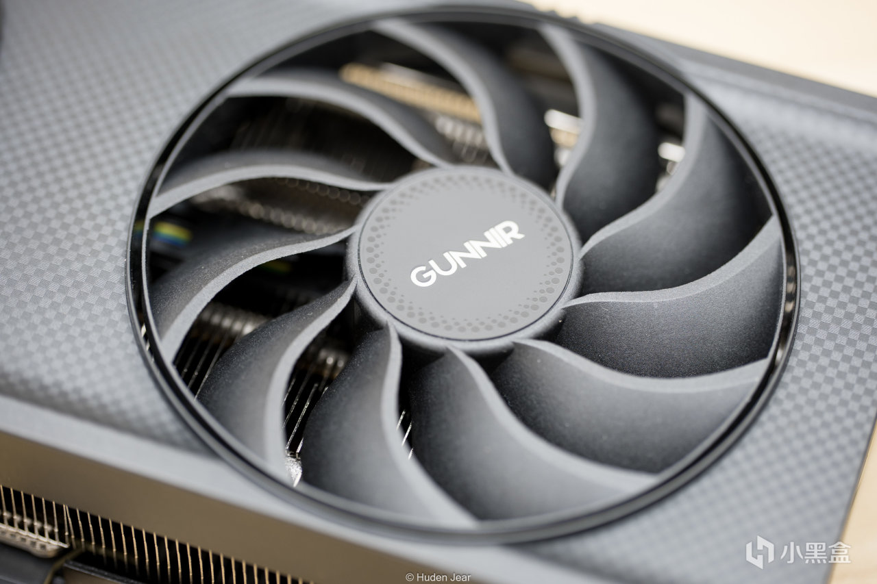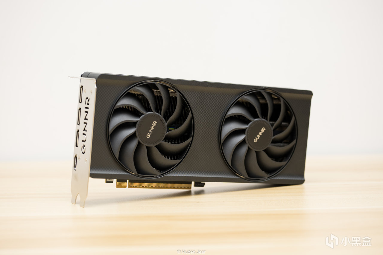 显卡正面上没什么装饰,算是弱项之一,外壳上有碳纤维状的图案,PCB上有一个gunnir的标志,显卡末端有几个方形的纹饰。受到某些逆天非公显卡影响,我现在对外观要求的接受度究极高,够简约已经是很不错的显卡了,所以看着Arc B580 Index甚至觉得十分乃至九分的好看