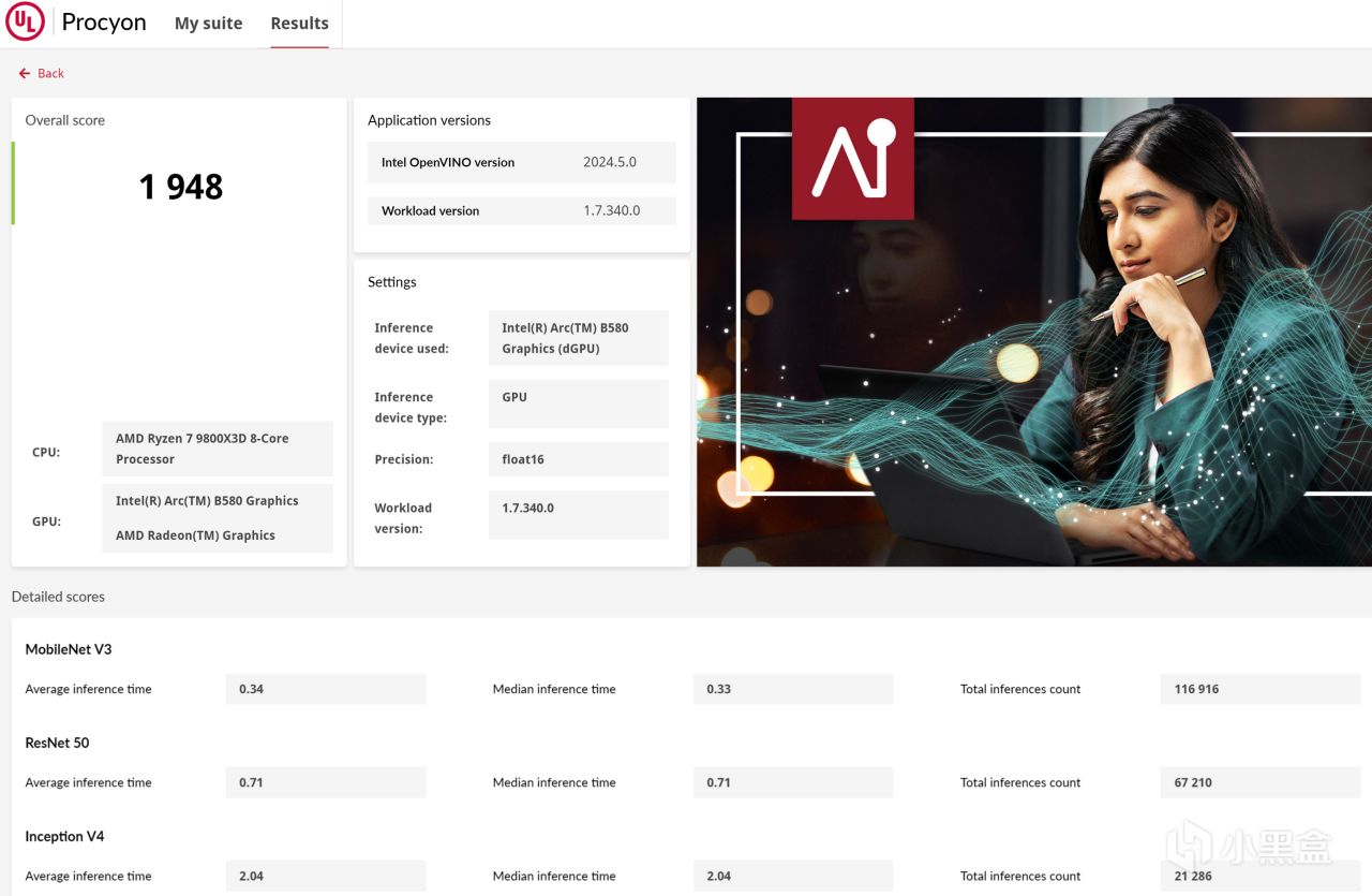 如果需要跑点深度学习相关的应用,Arc B580也能跑,而且比常规的OpenML要快一点,他自己有XMX构架,而且还支持OpenVino,跑图跑语言模型都有一点加成。比较典型的AI画图,按照常规参数无优化的512x512的图20轮,不到半分钟就能跑完,按照浮点性能计算的话,这反而比游戏更能跟理论性能对的上,成了优化最好的应用之一。不过训练就另说了,目前还不会openVino的训练操作