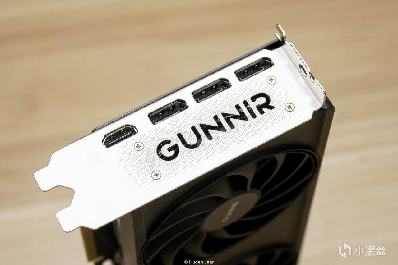 显卡的接口有一个HDMI2.1,以及3个DP2.1,这个规格超过了不少比他定位更高的显卡。挡板的LOGO和雕刻做的也挺精细
