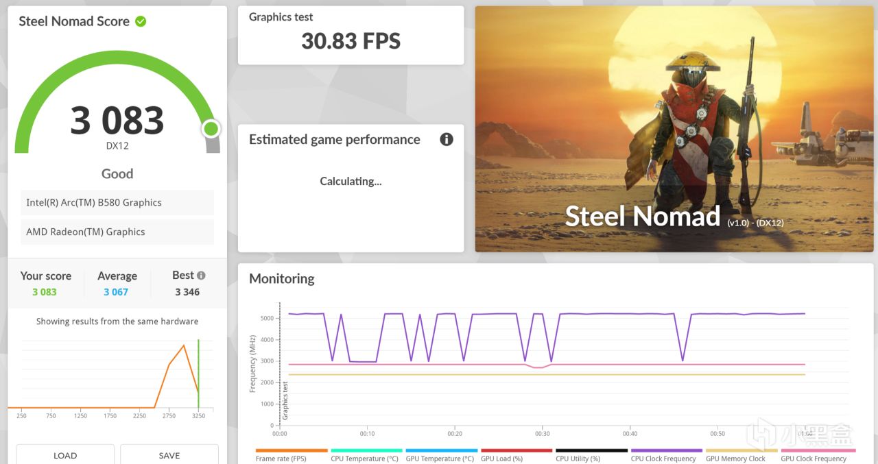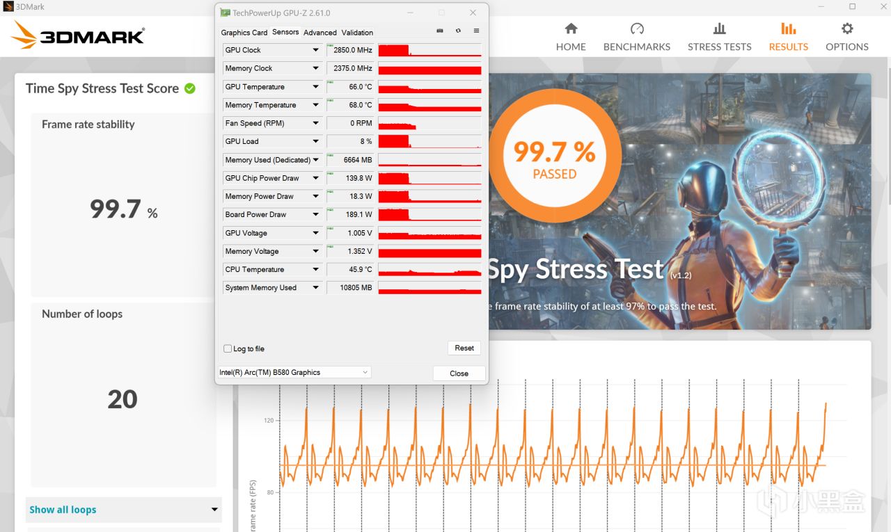 然后是烤机测试,Arc B580 Index的散热可以说是相当不错了,虽然作为入门非公在外观上稍逊,但是涉及到性能和实力的里子那是一点都没缩。显卡全程按照190W的TDP跑,跑完不降频,测试通过率达到了99.7%