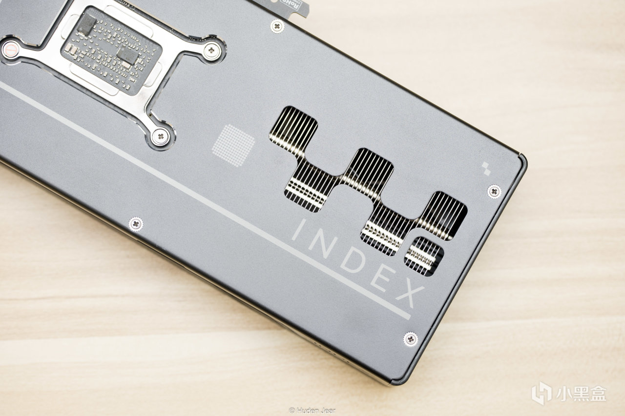 显卡肩侧的装饰就比较多了,这一面毕竟是直接面对机箱外面的,所以做得很精细,一边是intel ARC的标志,另一边是INDEX的镂雕。显卡供电接口是8pin,实际TDP也才180W,在这个显卡功耗暴增的年代属于是节能先锋了