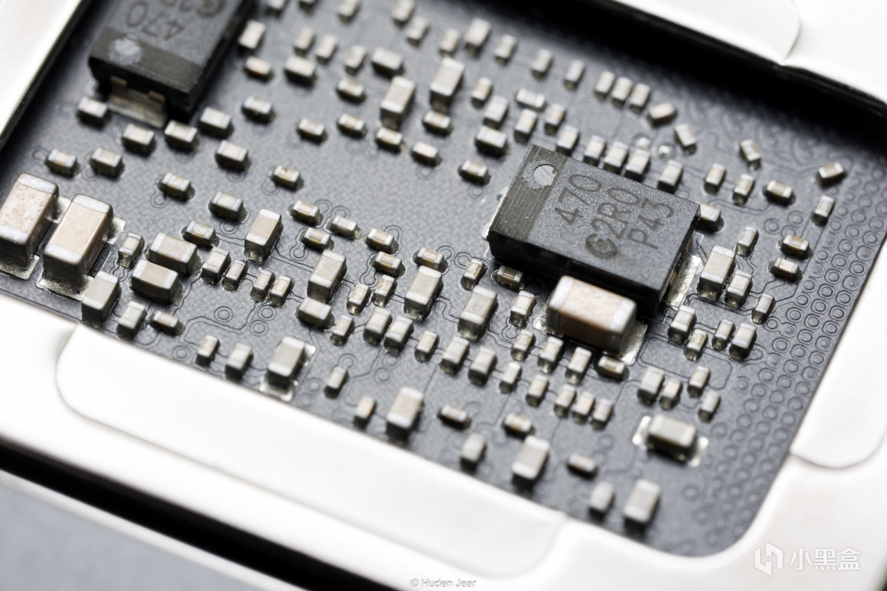 背板给的是相当的不错,使用了纯金属的背板,整块铝CNC而成,加工精度非常高,镂空和核心处的边缘还做了亮面倒角。核心背面的电容也很舍得给,MLCC和高导电容铺满了